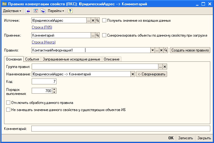 Теперь вернемся к правилу конвертации Контрагенты. Для выгрузки адреса нам придется пойти на определенную уловку. Сделаем правило конвертации свойств с источником ЮридическийАдрес, а в качестве приемника возьмем Комментарий. Реквизит, который не используется и остается пустым при загрузке. Выберем в поле Правило наше новое правило конвертации свойств.