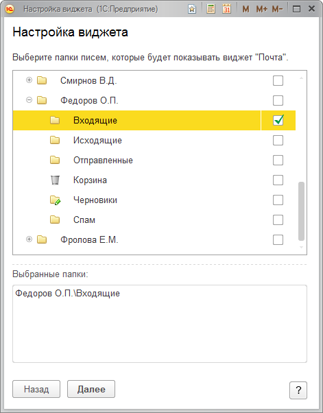 Содержит отобранные пользователями папки для отслеживания новые письма. Данные используются для виджета «Почта». |