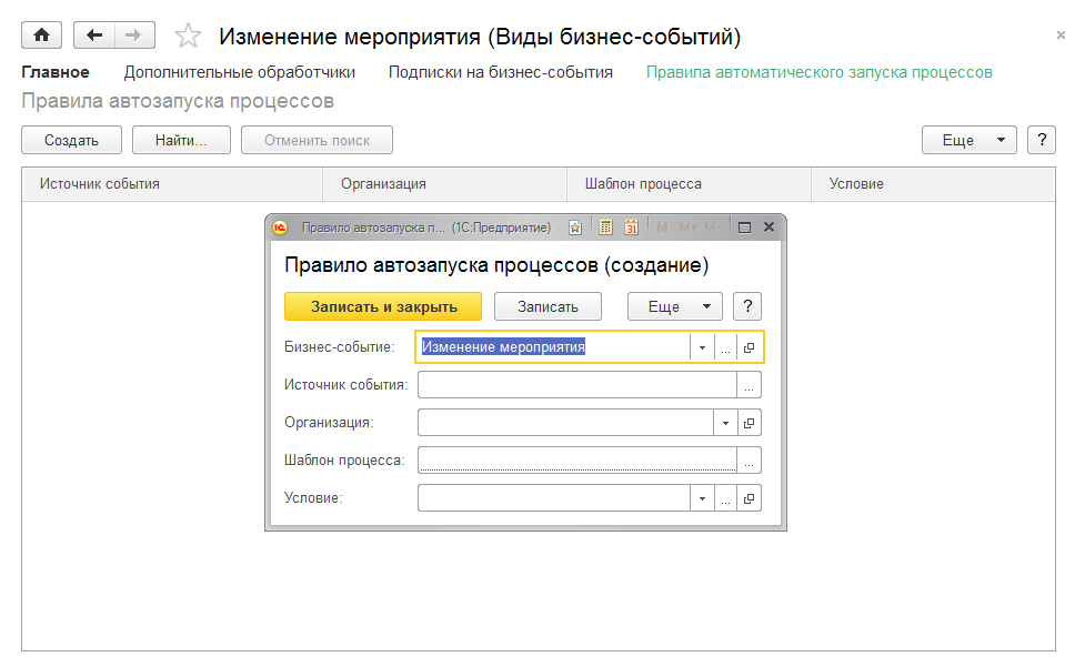 При этом запись добавляется в регистр сведений ПодпискиНаБизнесСобытия. В качестве потребителя записывается значение АвтоматическийЗапускБизнесПроцессов перечисления ПотребителиБизнесСобытий. На этом настройка завершается.