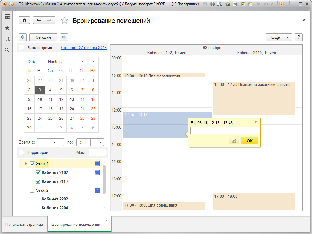 Дополнительно, для некоторых помещений ввод брони доступен только сотруднику, ответственному за помещение. Логика данного поведения прописана в функции ДоступноБронированиеПомещения в общем модуле БронированиеПомещений.
