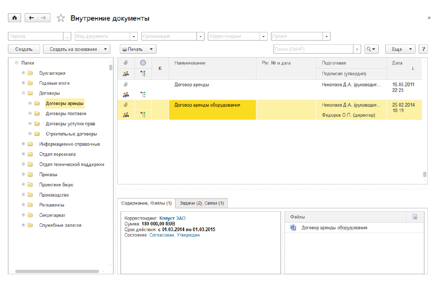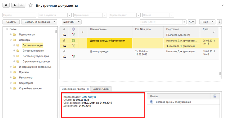 В списках документов область просмотра выводится с помощью одноименной команды в подменю Еще – Настройки. Отображение этой области настраивается для каждого списка и для каждого пользователя индивидуально. Область просмотра отображает сокращенное превью документа, которое содержит основные данные документа, список файлов документа, задачи, созданные на его основании, и таблицу связанных с ним объектов.