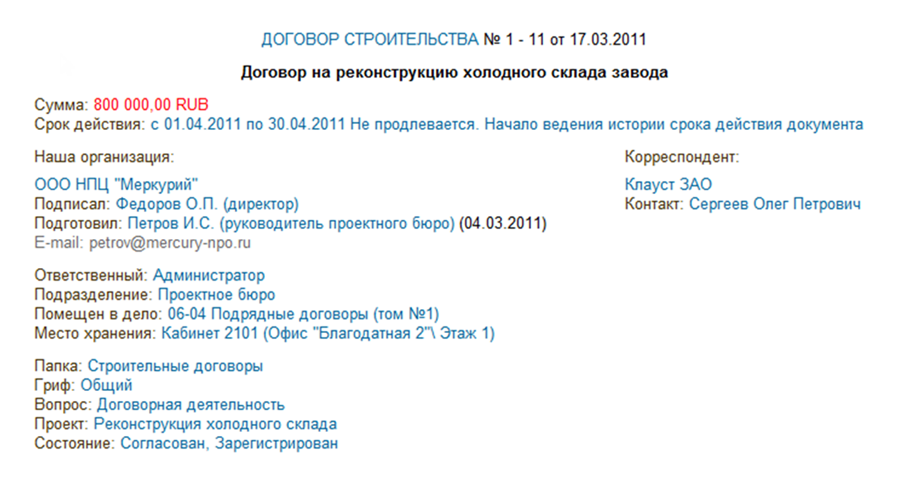 Практически все реквизиты, представленные в превью, являются ссылками, причем клик на разные данные порождает различные действия. Например, клик по электронной почте открывает форму создания письма на указанный адрес. Обработчик нажатия на реквизиты превью находится в общем модуле ДелопроизводствоКлиент ОбработатьНажатиеНаПолеОбзор. В настоящий момент процедура умеет отправлять письма, открывать сайты, переходить в формы различных справочников, а также открывать документ на нужной вкладке (например, может открыть закладку "Этапы" документа).
