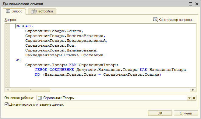 Для удобства пользователей решено показывать в списке товаров еще и поставщика, от которого получен этот товар. Для этого динамический список товаров использует произвольный запрос следующего вида: