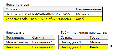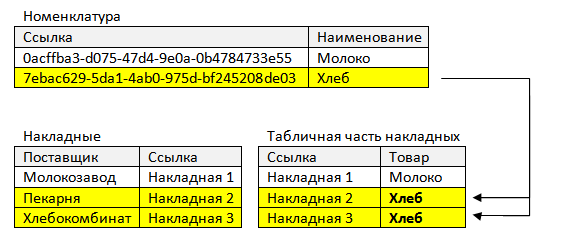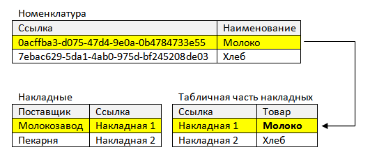 Таблица справочника Товары связывается с табличной частью документа Накладная и из таблицы документа выбирается поставщик, от которого получен этот товар.
