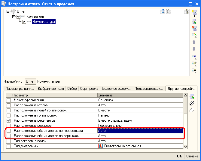 Система компоновки данных позволяет настраивать отображение общих итогов по горизонтали и по вертикали в отчете. Для управления расположением общих итогов используются настройки компоновки данных. При использовании конструктора схемы компоновки данных необходимо перейти на вкладку Настройки, а затем выбрать вкладку Другие настройки. На данной вкладке находятся параметры Расположение общих итогов по горизонтали и Расположение общих итогов по вертикали, позволяющие управлять расположением общих итогов в отчете.