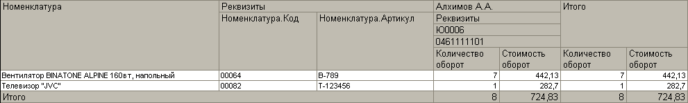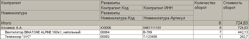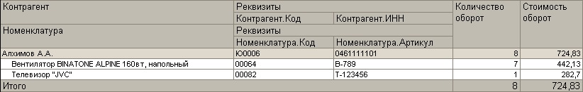 Стоит заметить что параметры Расположение общих итогов по горизонтали и Расположение общих итогов по вертикали можно использовать и для вложенных группировок. Например, в указанном ниже отчете для группировки Контрагент общие итоги отображаются в конце, а для группировки Номенклатура в начале и в конце.