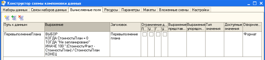 Таким образом, значением данного поля в случае, если значение поля СтоимостьПлан равно 0, будет строка Не запланировано, и процент от перевыполнения плана в противном случае.