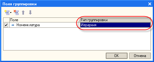 Изменим тип иерархии на "Иерархия". Для этого, в настройках отчета дважды щелкнем на группировке и изменим тип иерархии: