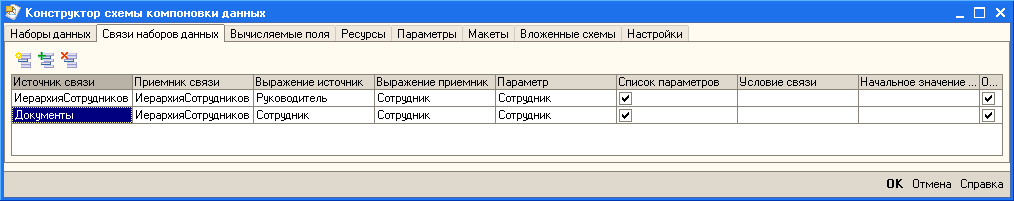 Для того чтобы данный набор данных получал по иерархии всех руководителей, опишем связь. В конструкторе схемы компоновки данных это делается на закладке "Связи".