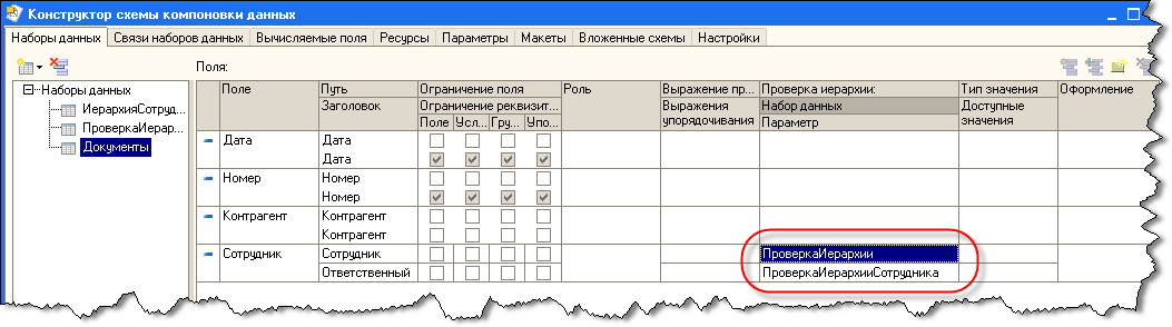 Теперь следует указать данный набор как набор данных проверки иерархии поля Сотрудник набора данных Документы. Это делается на закладке "Наборы данных" в таблице полей набора данных.