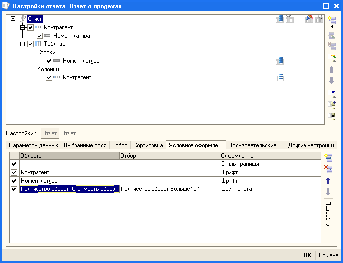 Поясним использование условных оформлений на следующем примере. Предположим, существует отчет о продажах, содержащий группировки Контрагент и Номенклатура. В данном отчете необходимо выделить жирным шрифтом - строки, отображающие контрагентов, наклонным шрифтом - строки, отображающие номенклатуру. При этом, если количество проданного товара больше 5, то необходимо отображать текст в полях КоличествоОборот и СтоимостьОборот красным цветом. Стиль рамки в отчете требуется изменить на пунктирный.