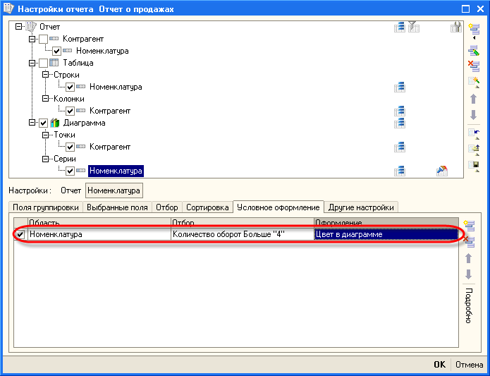 Для этого установим условное оформление для серии Номенклатура диаграммы. В оформлении установим свойство ЦветВДиаграмме равным цвету текста ОсобыйТекст. В качестве условия укажем, что цвет в диаграмме необходимо изменять, если Количество оборот больше 4.