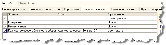 Порядок обработки элементов условного оформления следующий: сначала обрабатывается условное оформление группировок, затем обрабатывается условное оформление таблиц или диаграмм и в конце обрабатывается условное оформление всего отчета.