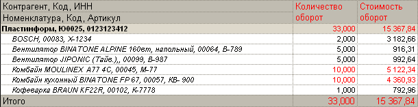 Наконец, укажем, что текст в колонках КоличествоОборот и СтоимостьОборот необходимо отображать красным цветом, если количество проданного товара больше 5.