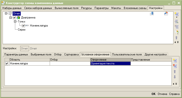 Для того чтобы текст поля Номенклатура выводился по вертикали, достаточно добавить в настройки отчета условное оформление для поля Номенклатура и указать в ориентации значение 90.