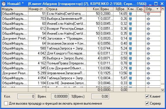 По колонкам "Клиент" и "Сервер" в замере производительности также возможна сортировка: для этого достаточно щелкнуть мышью в соответствующей колонке. При этом строки кода, исполнение которых происходило на клиенте или на сервере, будут сгруппированы.