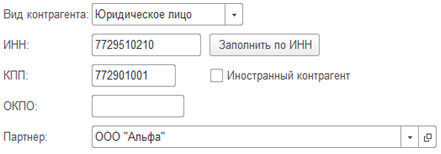 В "1С:Предприятии" версии 8.3.6 для выравнивания часто использовались декорации-"пустышки". Например, для того чтобы флажок "Иностранный контрагент" находился под кнопкой, между полем "КПП" и флажком "Иностранный контрагент" вставлена декорация для выравнивания флажка под кнопку: