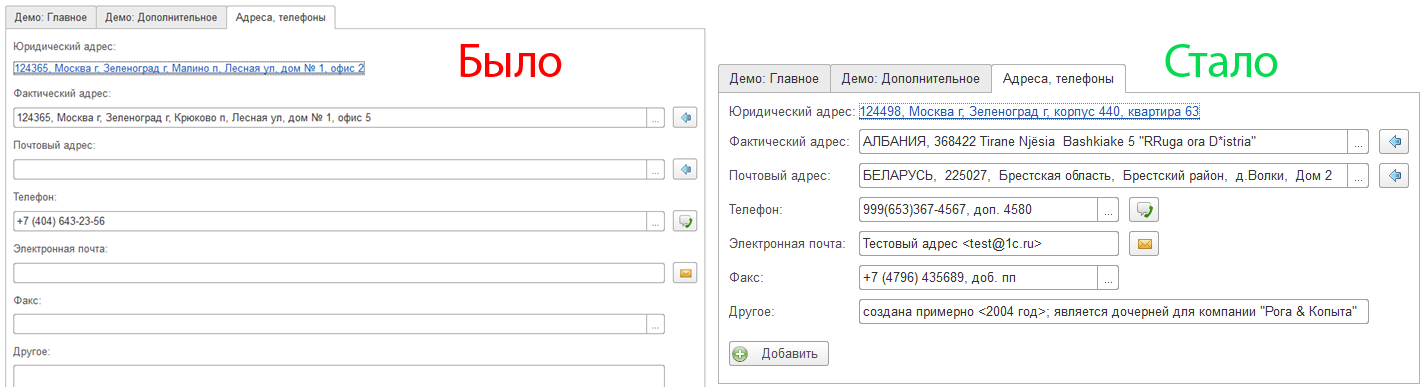 Существенно изменился внешний вид форм контактной информации. Удалось избавиться от большинства лишних параметров выравнивания, уменьшилось количество генерируемых элементов, по-умолчанию заголовки полей ввода теперь размещаются слева (не связано с "1С:Предприятием" версии 8.3.7).