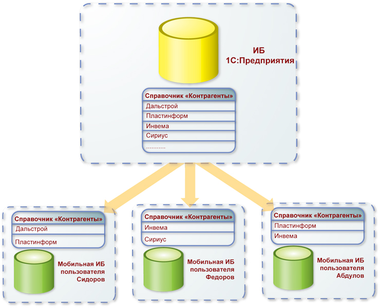 Таким образом, состав данных, используемых различными мобильными пользователями, может различаться: например. пользователю Сидорову необходима информация о тех контрагентах, с которыми работает непосредственно он; пользователю Федорову - информация о "своих" контрагентах (см. рис. ниже).