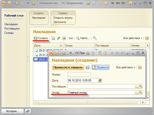 В результате новая накладная, создаваемая в режиме 1С:Предприятие, сразу же будет иметь заполненный реквизит Склад: