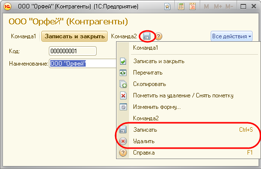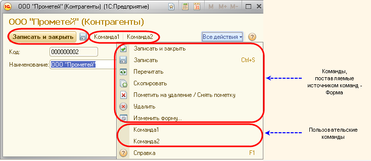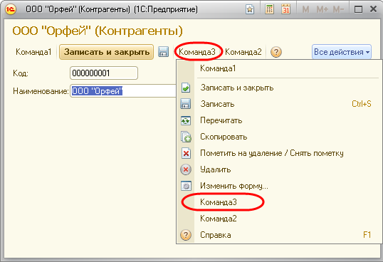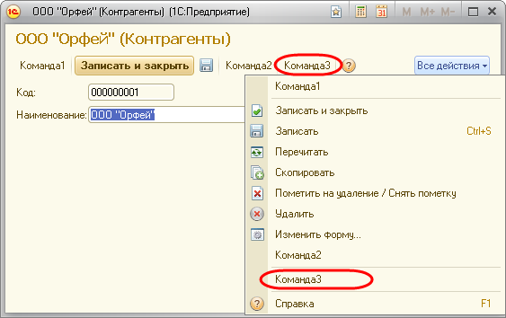 В результате в режиме 1С:Предприятия расположение кнопок, соответствующих созданным командам Команда1, Команда2 соответствует описанному выше алгоритму: в командной панели формы и в подменю Все действия сначала расположены команды, предоставляемые источником команд - формой элемента справочника (например, Записать и закрыть, Записать и др.), затем команды, созданные разработчиком (Команда1, Команда2), и затем команда Справка.