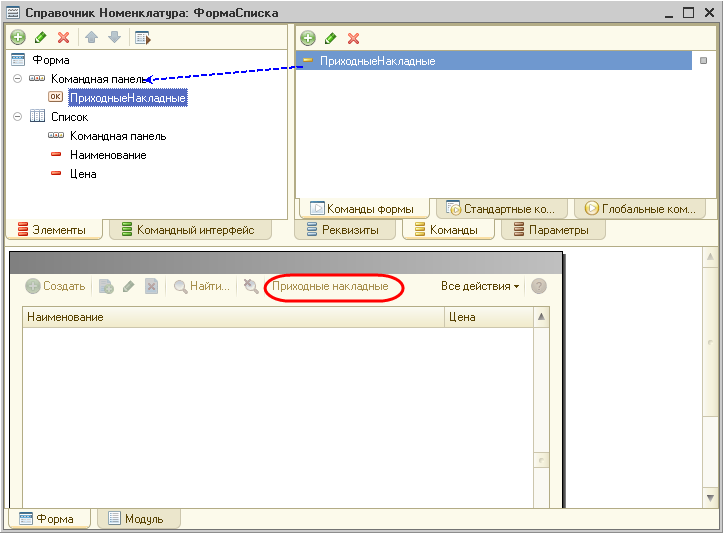 Для этого в форме списка номенклатуры создадим команду и соответствующую ей кнопку Приходные накладные.