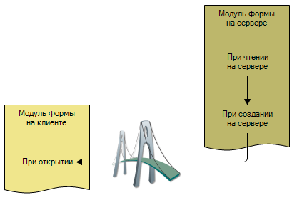 Когда открывается форма объекта, существующего в информационной базе, возникают три события формы: два - на сервере, и одно - на клиенте.