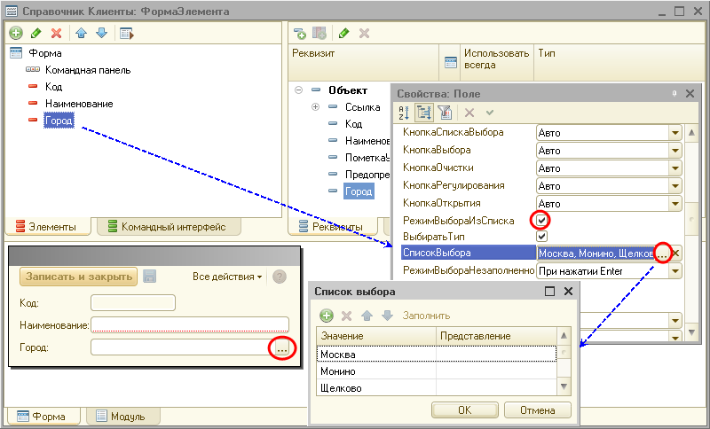 Демонстрационные примеры с интерактивно и программно сформированным списком выбора реквизита справочника находится в каталоге 1CITS/EXE/FAQ/List. Они выполнены на версии платформы 8.2.9.356.