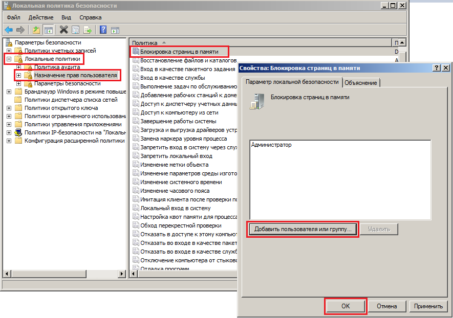 Установить разрешение на «Lock pages in memory» (блокировку страниц в памяти) для пользователя, от которого запущена служба Microsoft SQL Server