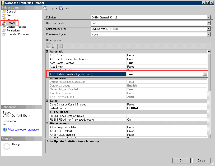 Установить модель восстановления, в зависимости от политики резервного копирования. Установить параметр «Auto update statistics asynchronously» = True