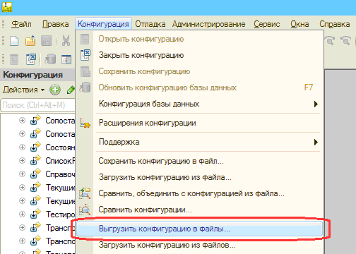 Откроем тестовую информационную базу в «Конфигураторе», выполним команду «Конфигурация ? Выгрузить конфигурация в файлы…»:
