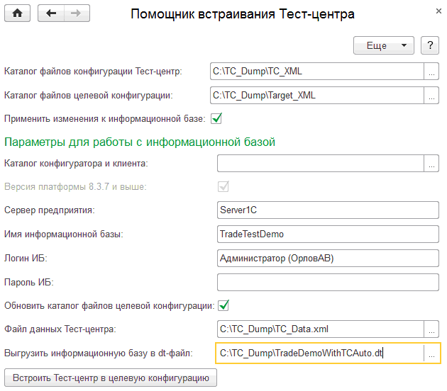 Данная обработка встроит конфигурацию «Тест-центр» в информационную базу «TradeTestDemo», расположенную на сервере «1С:Предприятие» Server1C. Метаданные «Тест-центра» будут взяты из файлов выгрузки в каталоге C:\TC_Dump\TC_XML, данные «Тест-центра» будут загружены из файла C:\TC_Dump\TC_Data.xml. Полученная тестовая информационная база будет выгружена в файл C:\TC_Dump\TradeDemoWithTCAuto.dt.