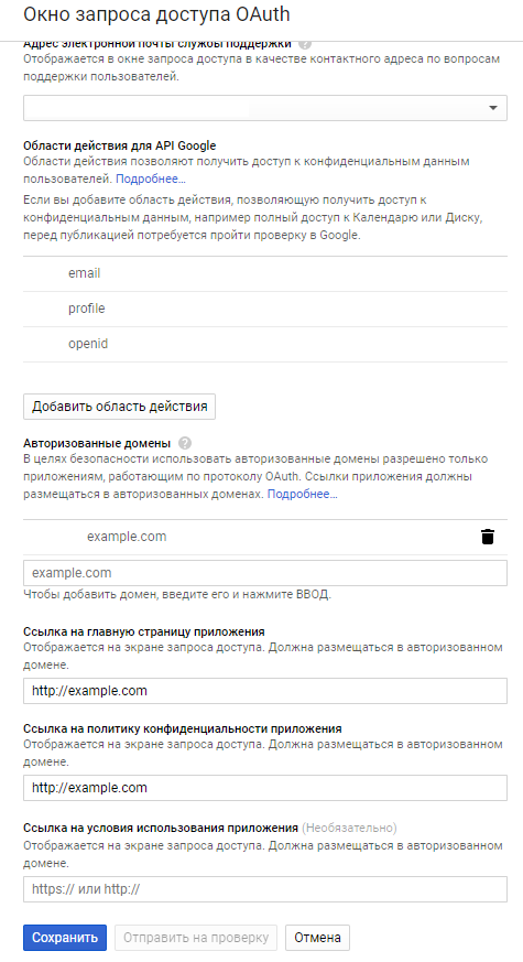 В открывшемся окне настройки запроса доступа OAuth необходимо указать авторизованный домен, нажать на кнопку «Сохранить» и перейти к настройке ключа API OAuth2 аутентификации.