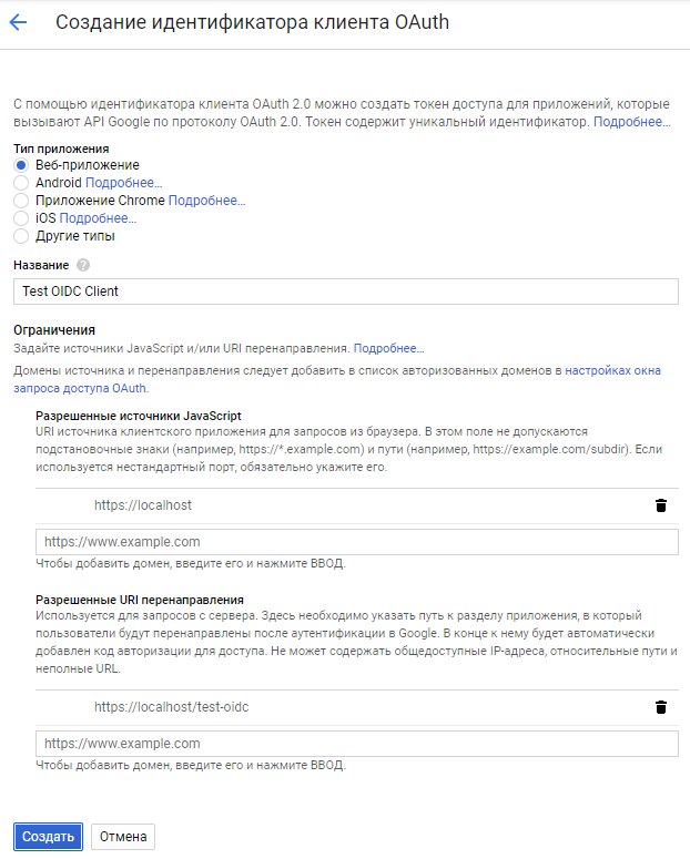 В окне создания идентификатора укажите следующие обязательные параметры: