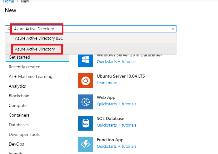 В окне мастера добавления ресурсов необходимо найти или выбрать в списке Azure Active Directory.