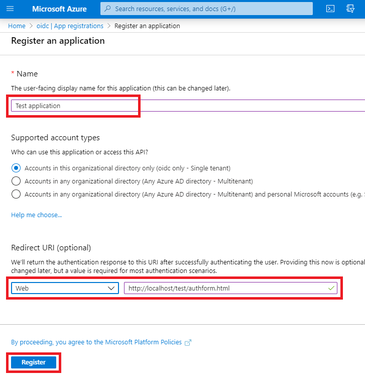 В окне регистрации приложения, заполните следующие значения (на изображении поля выделены красной рамкой) и нажмите кнопку «Register»: