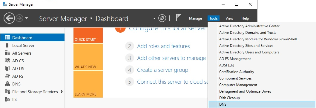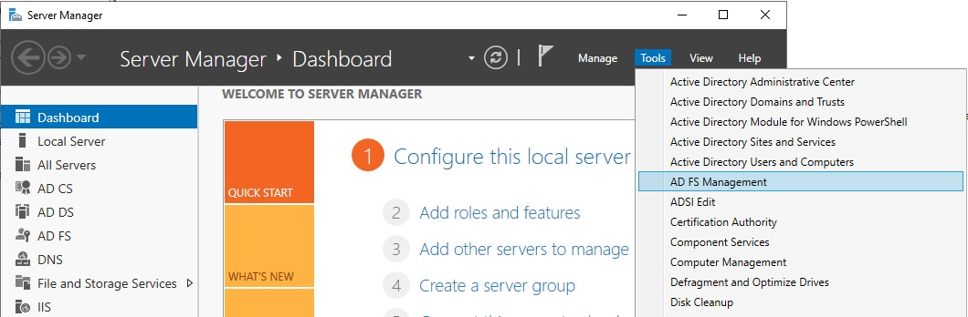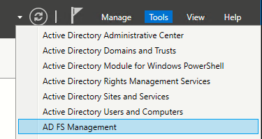 Для этого необходимо в диспетчере сервера нажать на кнопку «Средства», далее «Управление AD FS» («Tools» - «AD FS Management»):