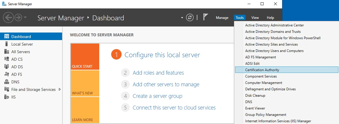 Для того, что его открыть необходимо в диспетчере сервера нажать на кнопку «Средства», далее «Центр сертификации» («Tools» - «Certification Authority»):