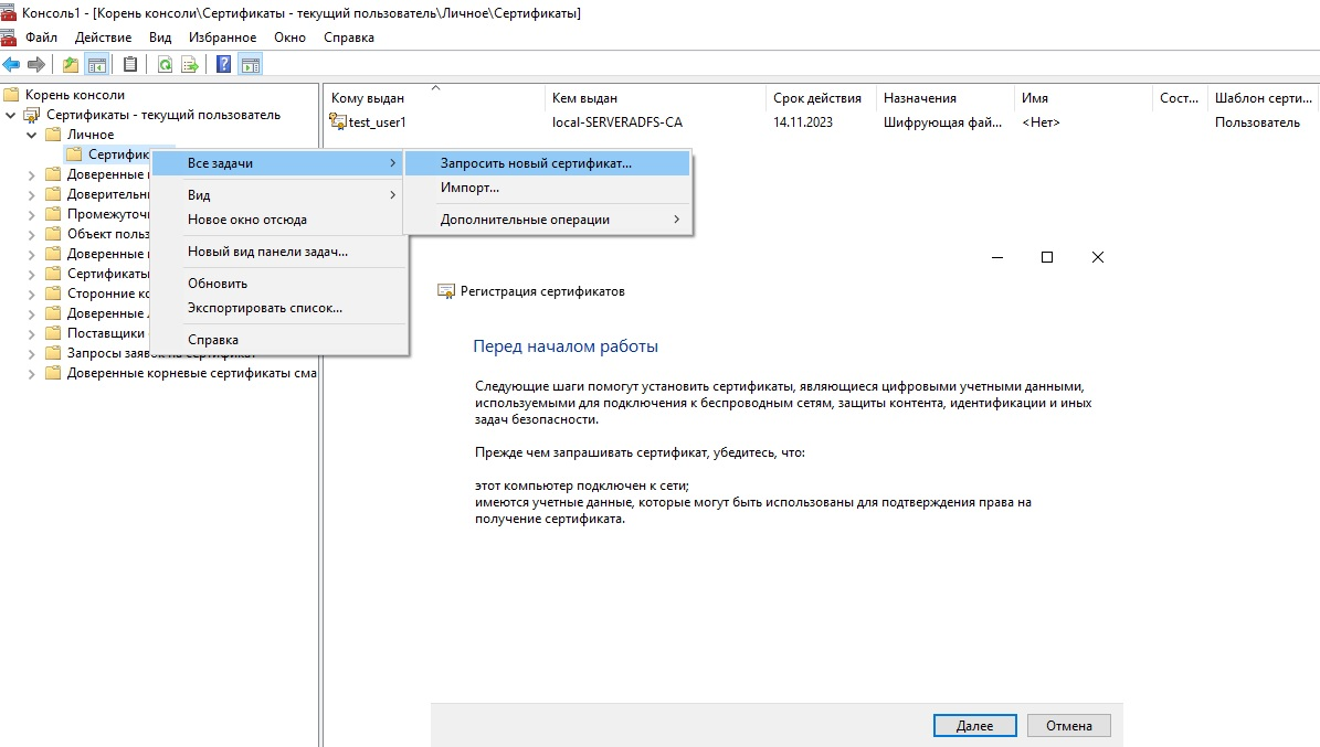 Теперь вы можете увидеть запрошенный и зарегистрированный сертификат в личном хранилище в оснастке «Сертификаты – текущий пользователь».