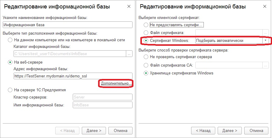 тогда в настройках подключения информационной базы необходимо указать, что подбор клиентского сертификата будет выполняться автоматически: