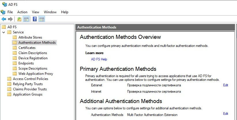 В оснастке AD FS необходимо убедиться, в разделе «Методы аутентификации» («Authentication Methods») в качестве основного метода проверки подлинности