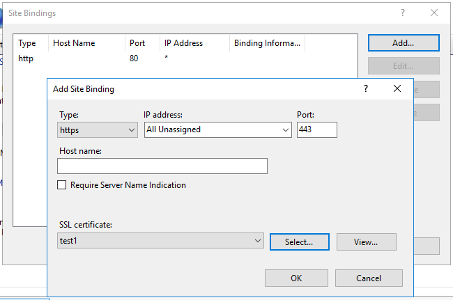 В этом окне можно увидеть, что публикация работает только на порту 80, который относится к незащищенному протоколу HTTP. Чтобы его расширить, нажмите кнопку Добавить… (Add…) слева от списка привязок сайта и в открывшемся окне выберите Тип (Type) в качестве значения "https". Завершением настройки будет выбор ранее импортированного сертификата в списке "SSL-сертификат" ("SSL certificate"). Нажимаем кнопку OK и закрываем мастер привязок сайта.