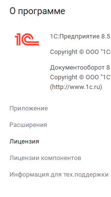 - После запуска приложения в диалоге «О программе» свойство «Лицензия» под строкой «Текущая» в интерфейсе «Такси» или на отдельной странице «Лицензия» в интерфейсе «8.5» содержит информацию об используемой клиентской и серверной лицензии.