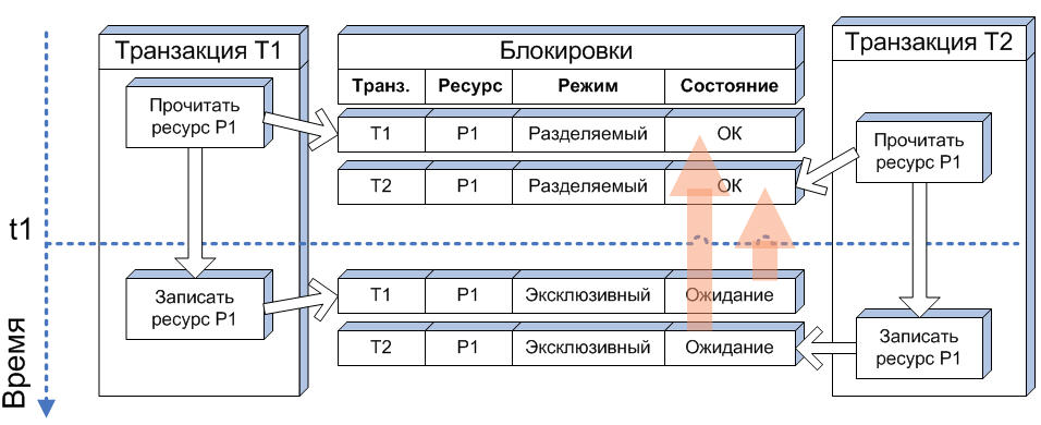 Схема возникновения взаимоблокировки такова. Две конкурирующие транзакции (Т1 и Т2) читают один и тот же ресурс – Р1. При этом устанавливаются разделяемые блокировки на этот ресурс. Разделяемые блокировки от конкурирующих транзакций могут существовать одновременно, поэтому к моменту времени t1 обе транзакции успешно установили свои блокировки и продолжают работу.