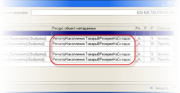1.1. Процесс 1 выполняет запрос контроля остатков в строке 506 модуля набора записей регистра накопления "ТоварыКПередачеСоСкладов". Рассмотрим фрагменты кода процедуры "КонтрольСвободныхОстатков_Реализация", обращая внимание только на обращения к таблице "ТоварыНаСкладах.Остатки".