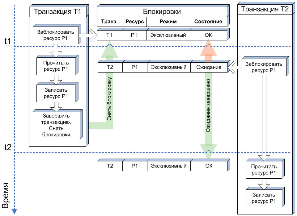 В этом случае транзакция Т1 успевает первой заблокировать ресурс Р1. Транзакция Т2 пытается установить аналогичную блокировку, но не может этого сделать и становится в ожидание на блокировке.