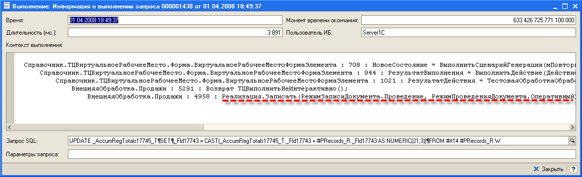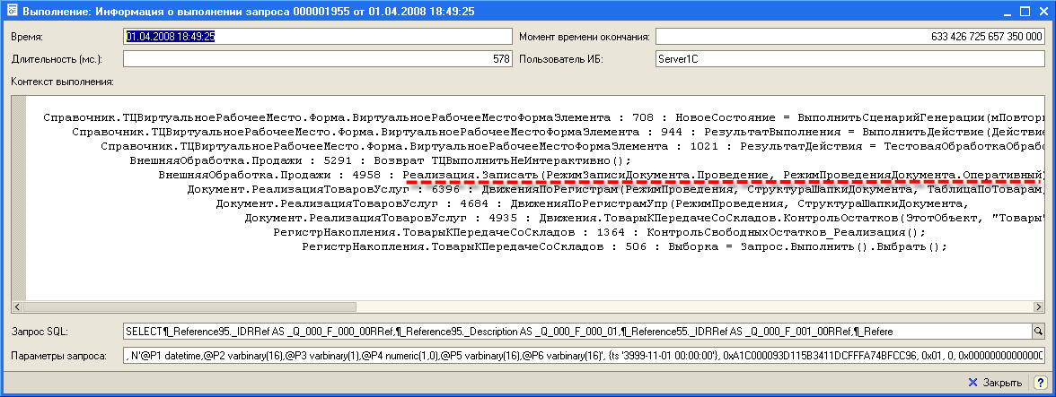 Открыв форму выполнения запроса, мы увидим полный стек вызовов кода конфигурации. Из этого стека становится понятно что интересующий нас запрос выполнялся при проведении документа "РеализацияТоваровУслуг" (в коде тестовой обработки соответствующая переменная имеет имя "Реализация").