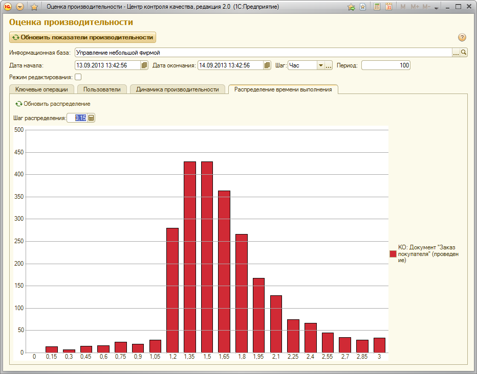 С помощью встроенной обработки "Оценка производительности" (её можно найти в настройках контрольной процедуры "Контроль производительности") существует возможность получать распределение времени выполнения одной или нескольких ключевых операций за любой период времени.
