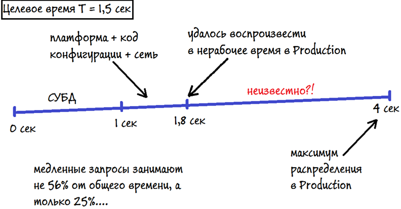 Удалось воспроизвести 1,8 секунды, что больше целевого времени на 0,3 секунды. Это означает, что мы воспроизвели медленное выполнение операции. Если все пользователи будут выполнять операцию ровно за это время, то Apdex будет в районе 0,5. Отлично, дальше разбираемся с тем, на что уходит время. Видим, что практически 1 секунда уходит на выполнение запросов сервером СУБД. Понимаем, что 56% времени (больше половины) уходит в СУБД, оптимизируем неоптимальные запросы. В результате в лучшем случае максимум распределения в рабочей системе сдвигается с 4 секунд до 3 секунд. Производительность недостаточная. Проблема не решена. Проверяем, как выполняется операция в рабочее и в нерабочее время. Понимаем, что большая часть времени (а именно, 2,2 секунды) уходит куда-то именно под нагрузкой. Т.е. основная проблема тут очередь! Где именно, мы пока не знаем.