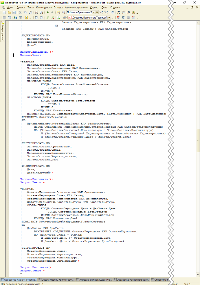 По замеру производительности, дольше всего выполнялись запросы временных таблиц ДатыПризнаковНаличияОстатковДляДня и КоличествоДнейНаПродажеСУчетомОстатков (нижние два на рис. 4)